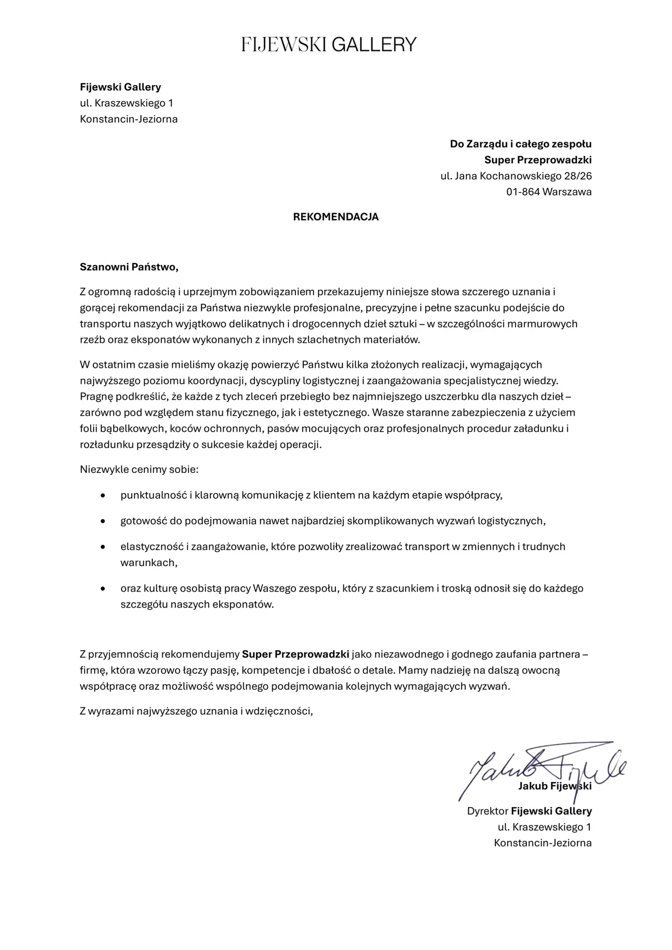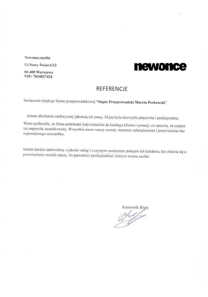 Wierzymy, że najlepszym dowodem na jakość naszych usług są słowa zadowolonych klientów. To właśnie opinie i referencje świadczą o naszym profesjonalizmie, zaangażowaniu i dbałości o każdy szczegół. Naszym celem jest, by każda przeprowadzka przebiegła sprawnie i bezproblemowo, a zadowolenie klientów jest dla nas najwyższym priorytetem. Dziękujemy za zaufanie i zapraszamy do zapoznania się z tym, co mówią o nas inni – to najlepszy sposób, aby przekonać się, że jesteśmy właściwym wyborem.